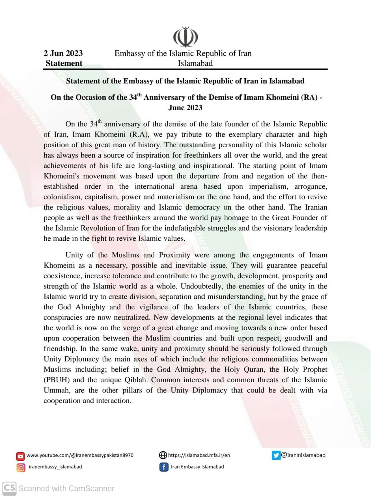 Statement of the Embassy of the Islamic Republic of Iran in Islamabad